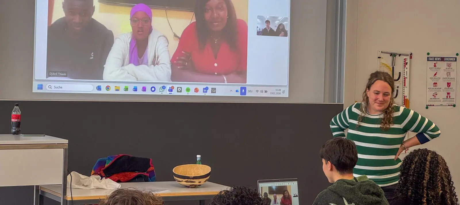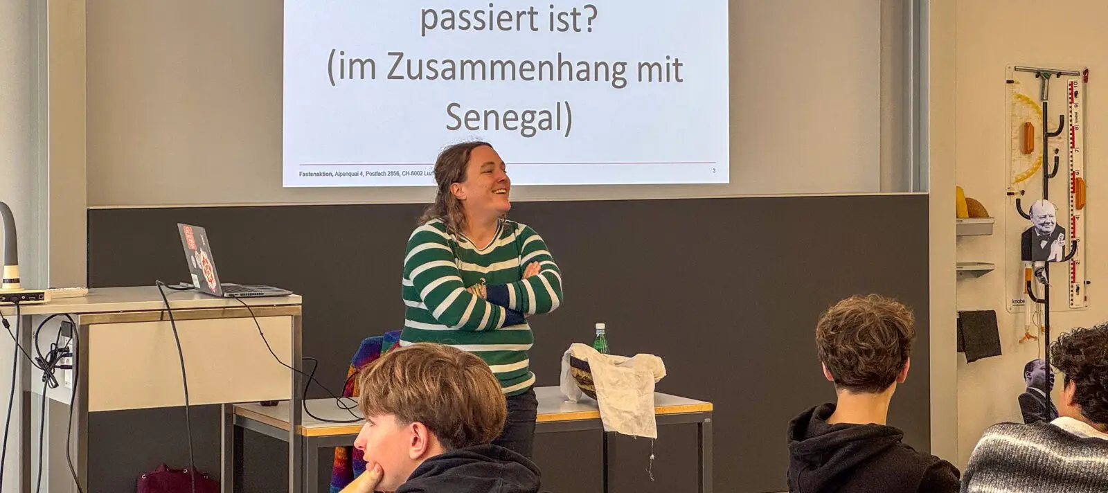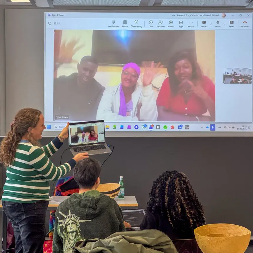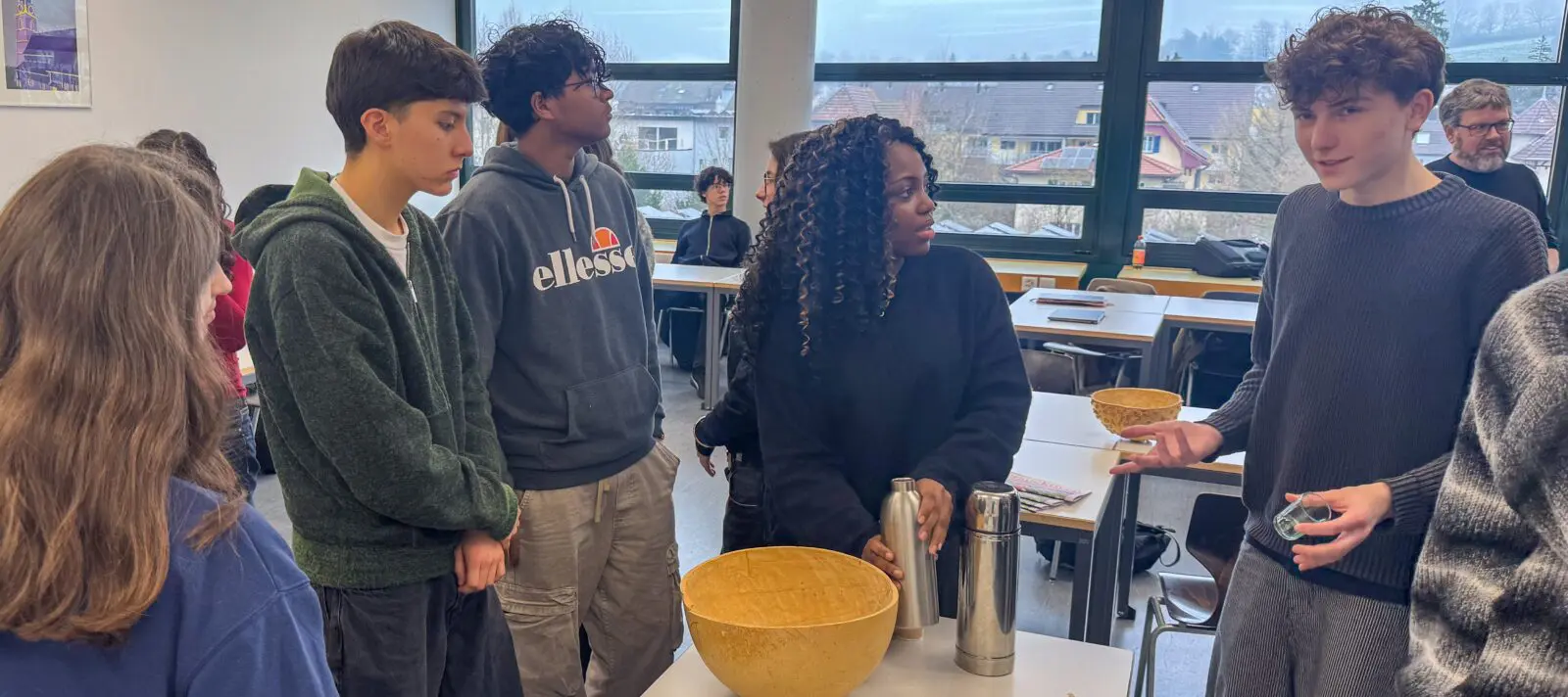 Pour la trentaine d’élèves âgé·e·s de 15 à 17 ans, cette double période intervient au terme d’un travail approfondi mené dans le cadre de l’option « sciences sociales », consacrée au développement en Afrique de l’Ouest. Cette matière regroupe la géographie, l’histoire et l’économie, et réunit des élèves de plusieurs classes. Avant l’appel vidéo, Vreni Jean-Richard leur présente le Sénégal, les relations économiques parfois problématiques entre la Suisse et les pays du Sud global, ainsi que le travail concret d’Action de Carême – notamment le fonctionnement des groupes de solidarité au Sénégal, particulièrement efficaces. Pendant la pause, un thé sénégalais typique est servi et semble beaucoup plaire.